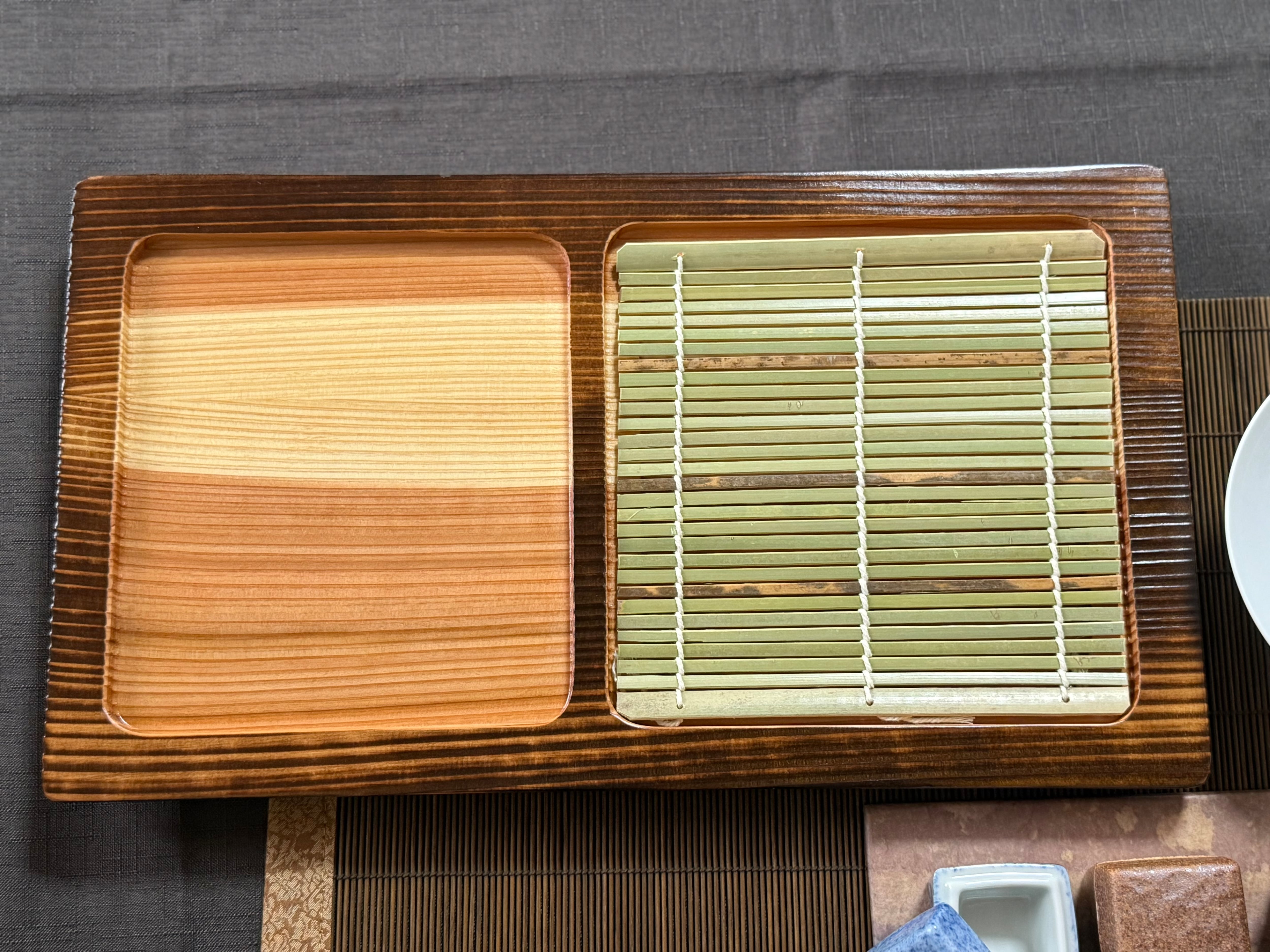 ☆くり抜き加工の素材感ある表情で蕎麦の盛り付けを引き立てます。
