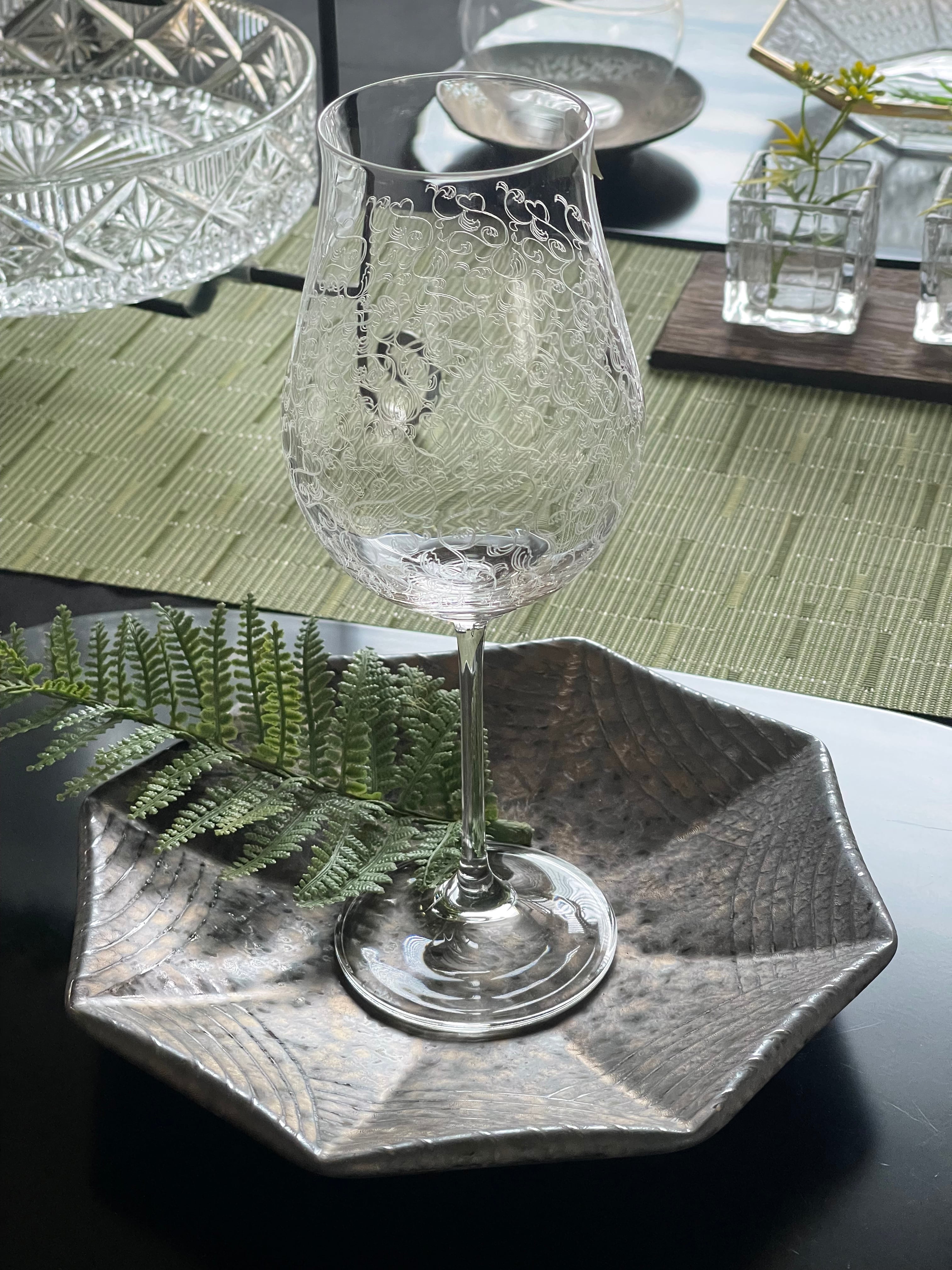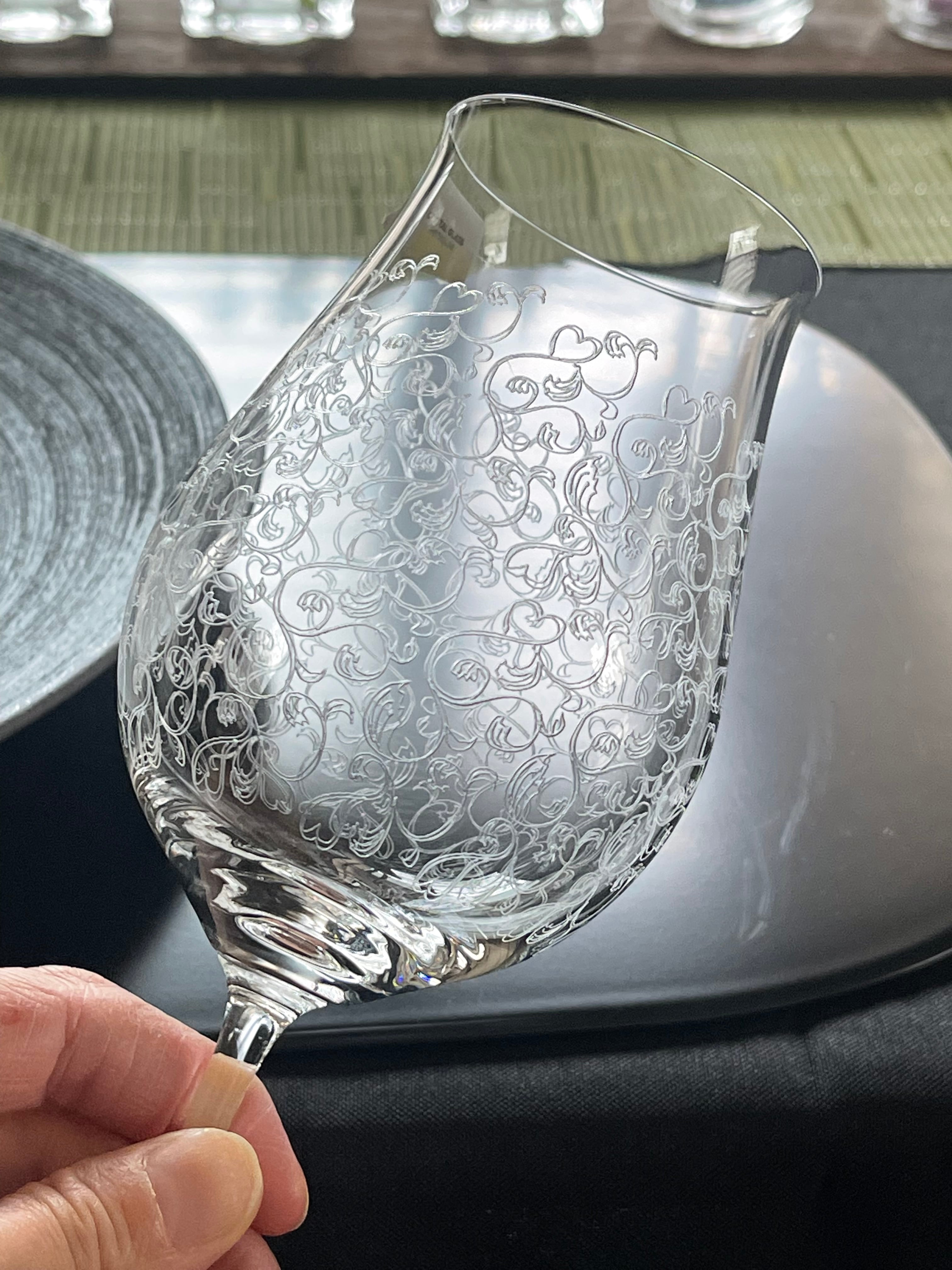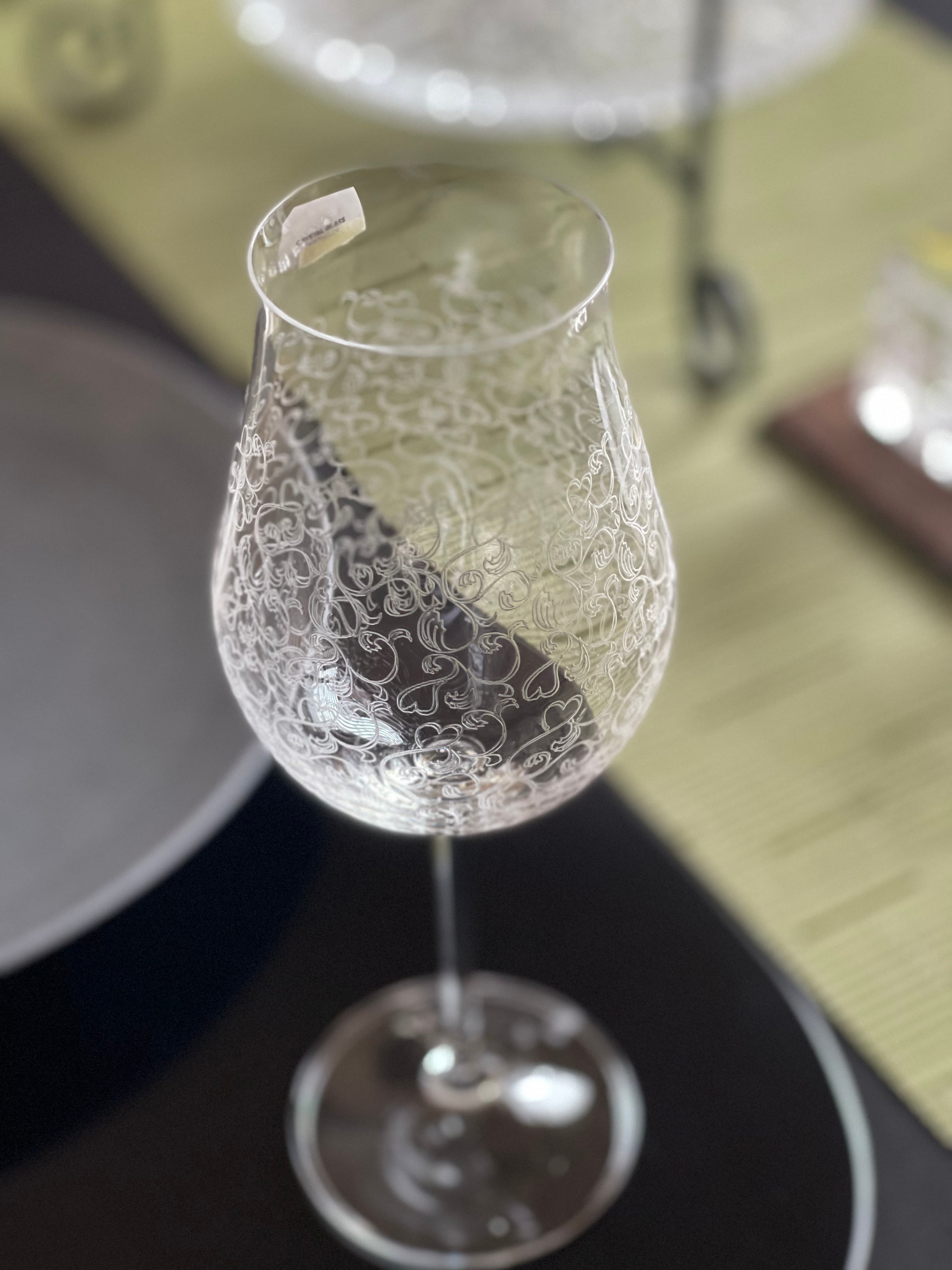 美しいパントエッジングのワイングラスです。