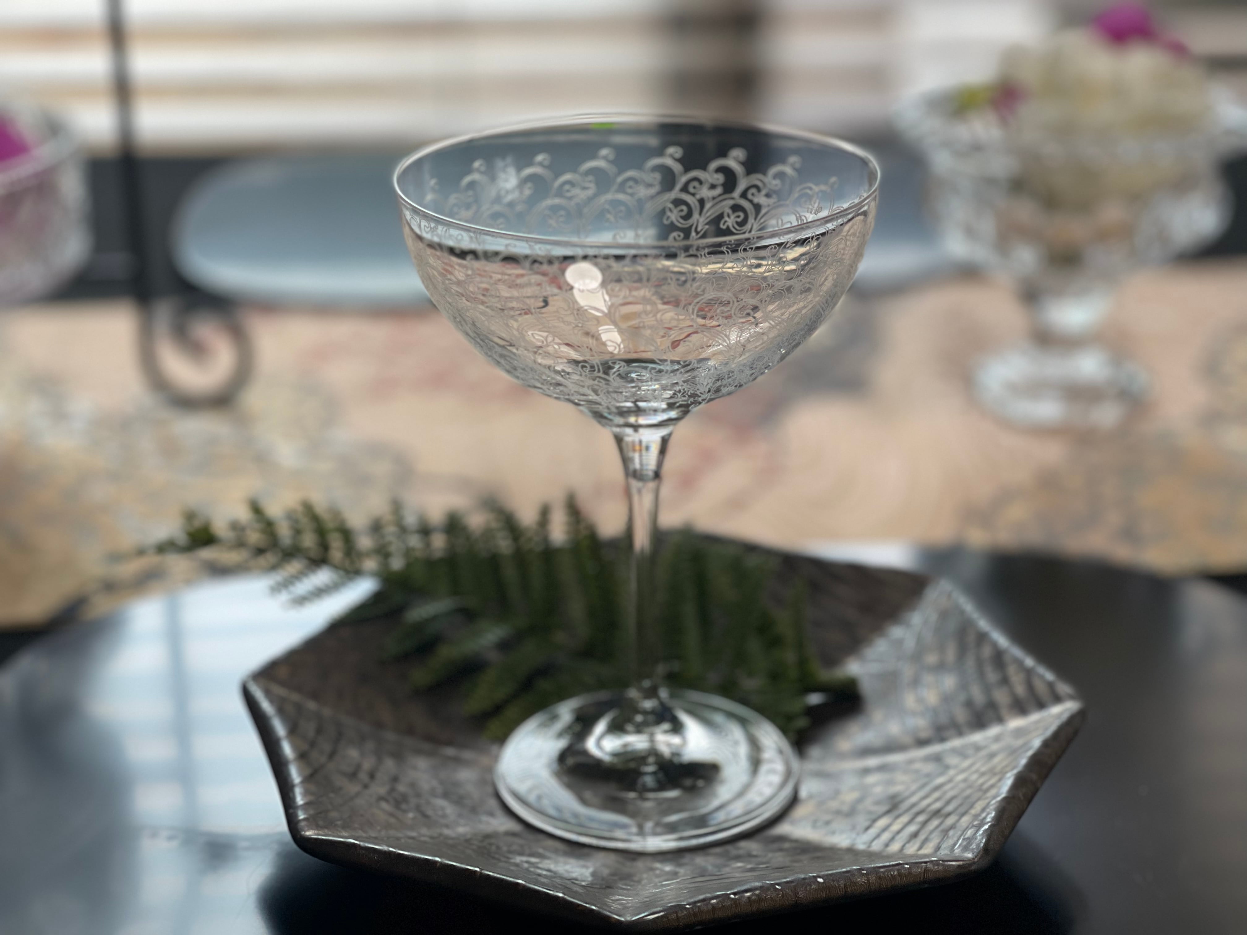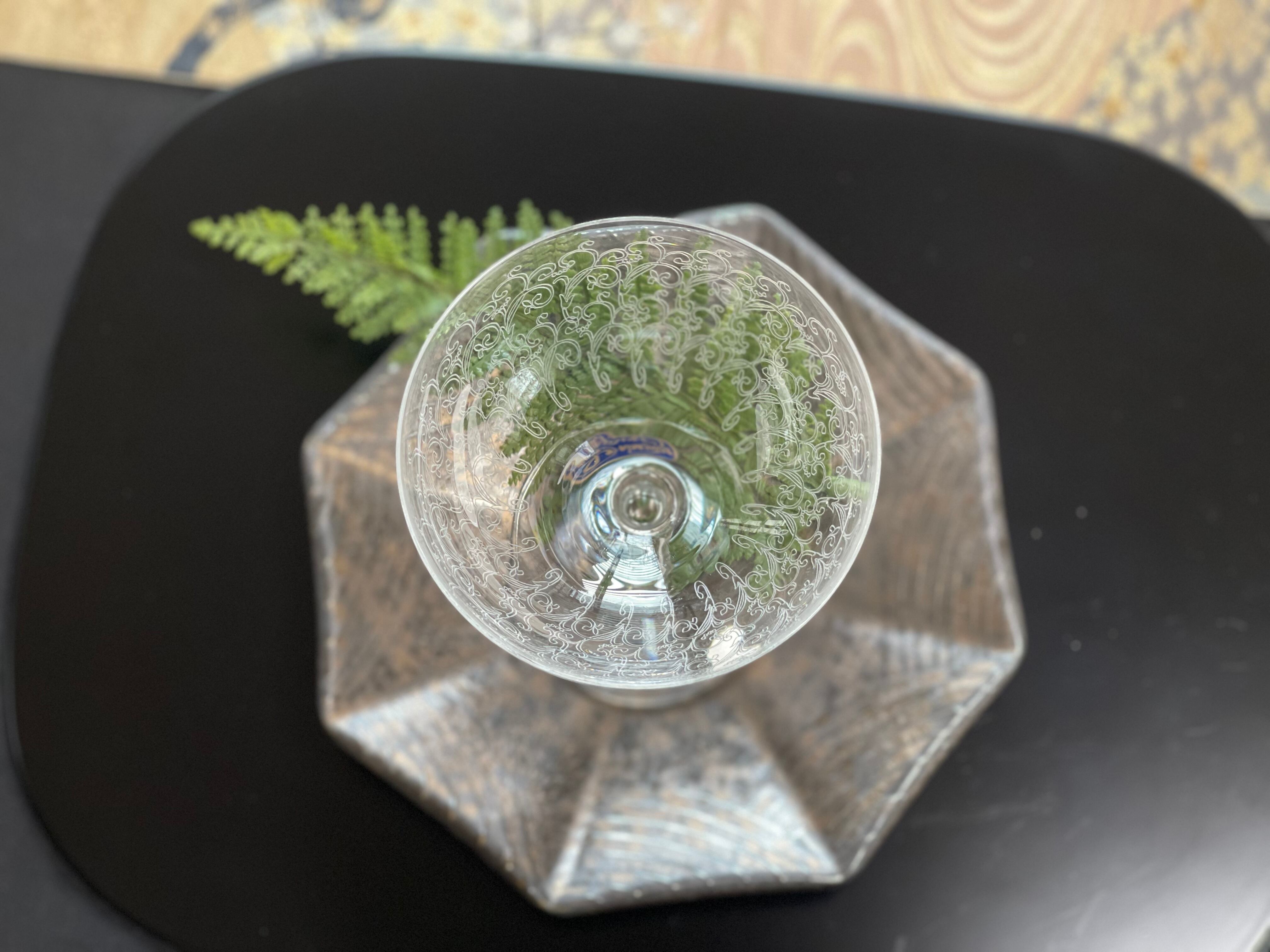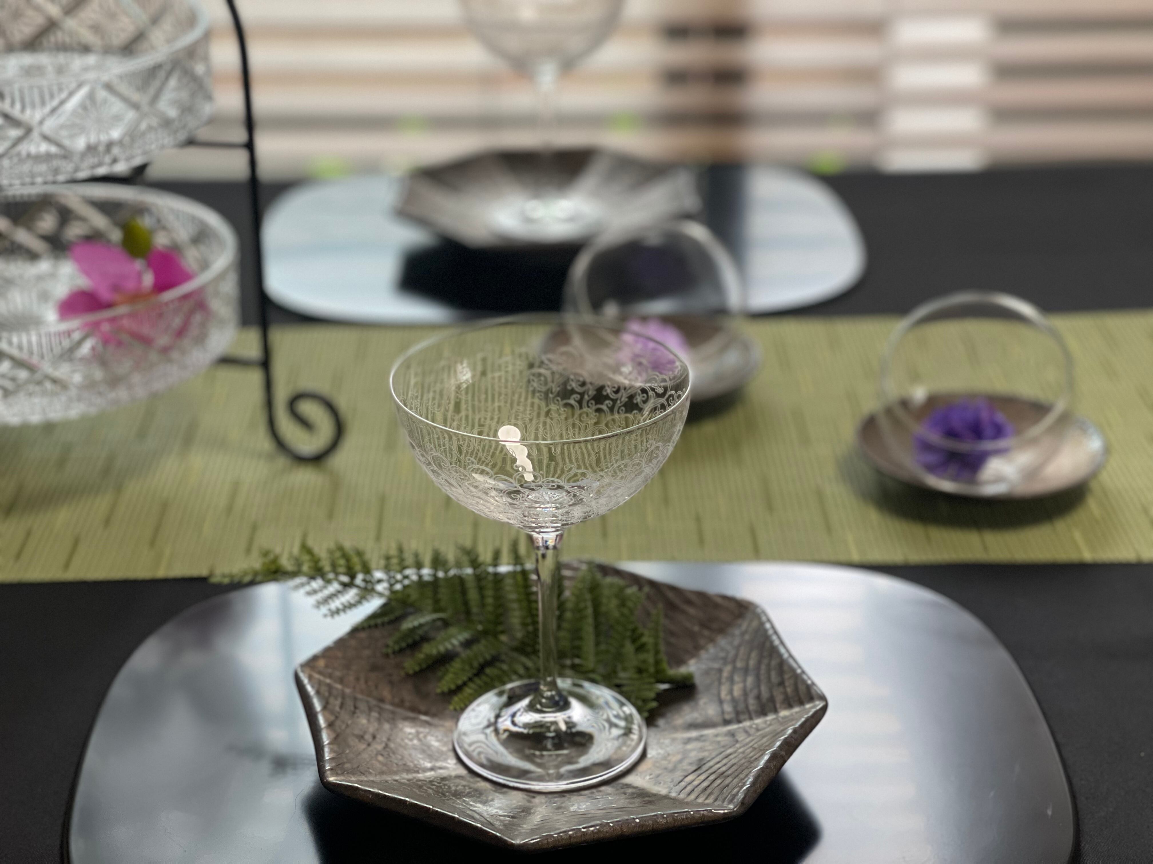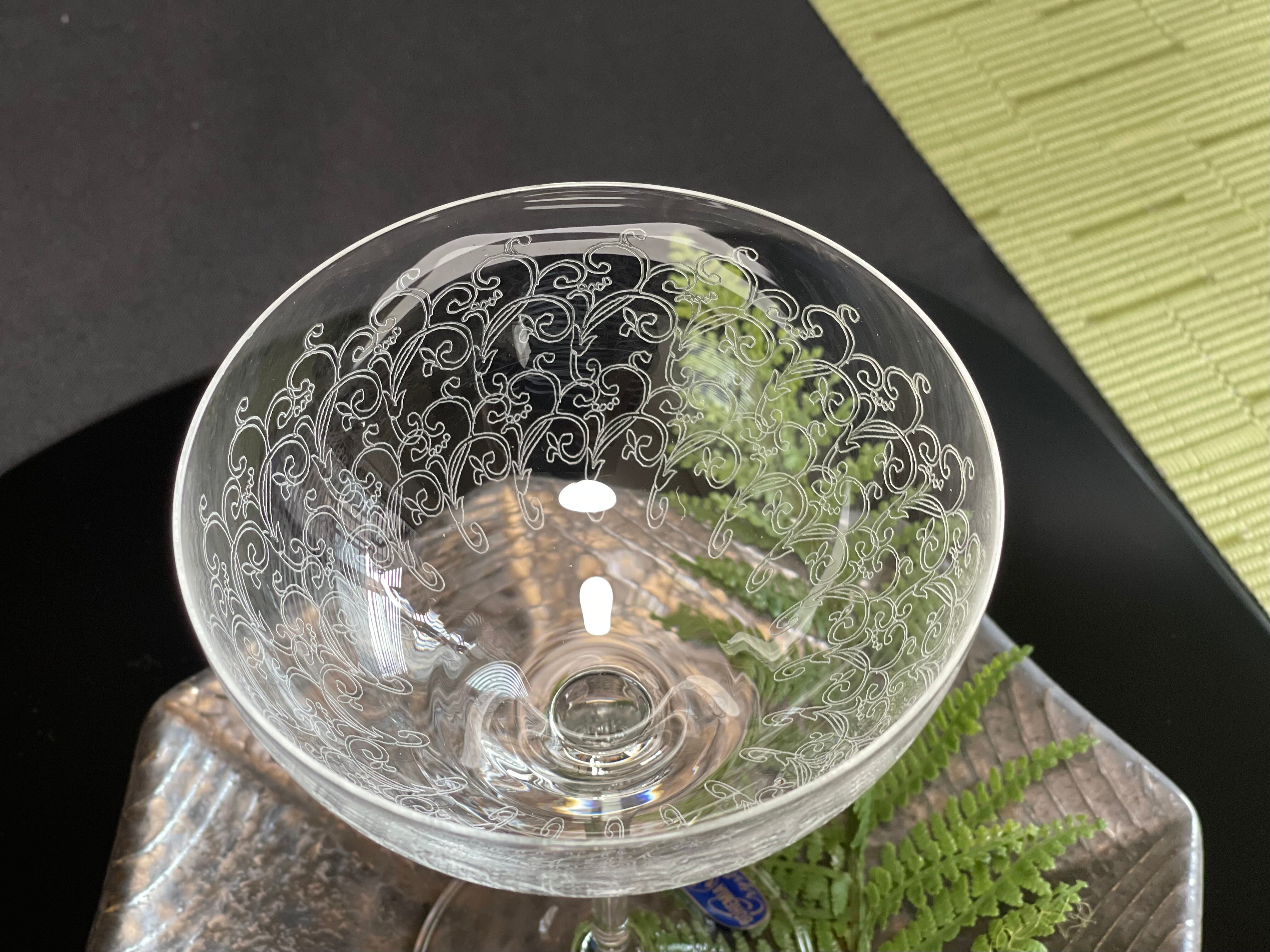 美しいパントエッジングがあしらわれたワイングラスです。ワインだけではなく、スイーツや前菜にご利用頂いても素敵ですね♪